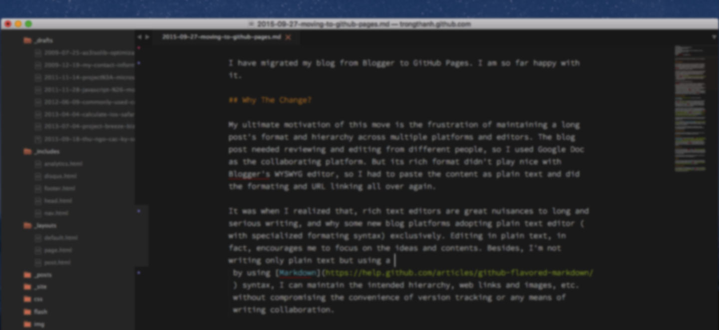 At the end of the day, moving my blog from Blogger (archive site) to GitHub Pages (source code) is a smooth transition and returning visitors may only notice the change in theme and a much faster loading time.