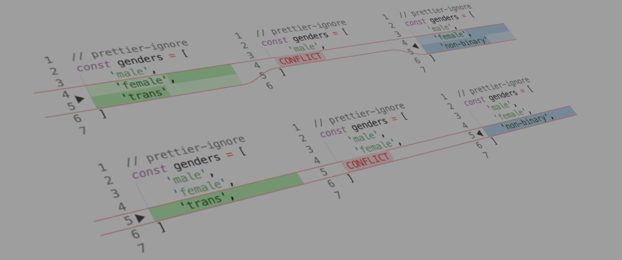Trong ví dụ không dùng trailing comma, mặc dù phần tử female đều thêm cùng một dấu phẩy, Git vẫn không tự động merge dòng này và vẫn báo conflict cùng với dòng thay đổi tiếp theo. Việc theo dõi những dòng conflict vô nghĩa này sẽ gây khó khăn cho người merge và rất dễ gây ra sai sót bị mất code sau khi resolve.